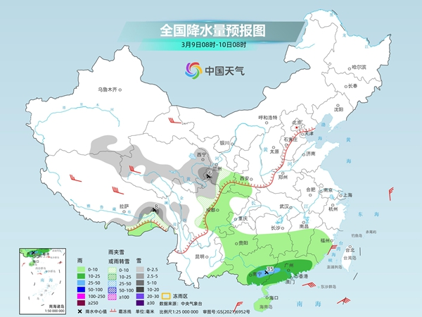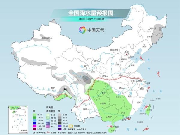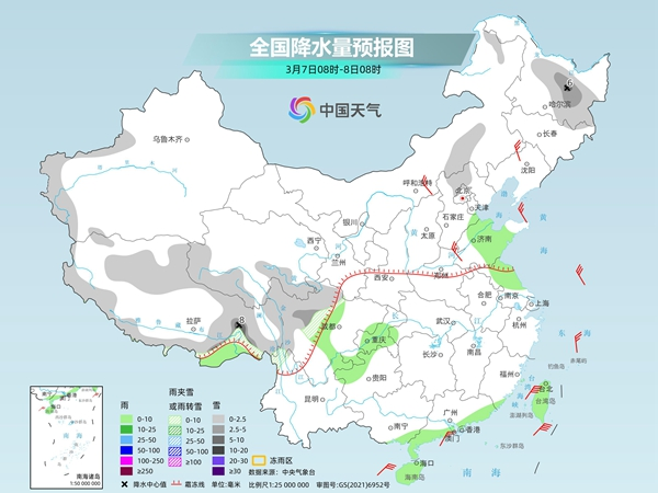 今天,南方降水繼續(xù)縮減,中東部大部將維持晴朗的天氣格局。中央氣象臺預(yù)計,內(nèi)蒙古中東部、河北北部、黑龍江中部、新疆伊犁河谷和南疆西部山區(qū)、西藏西部和東部、青海南部、川西高原北部等地部分地區(qū)有小雪或雨夾雪,其中,黑龍江中東部、西藏東南部、川西高原北部等地部分地區(qū)有中到大雪。西藏南部、山東大部、江蘇中北部、四川盆地西部、重慶大部、貴州西北部、廣西東南部沿海、廣東南部、海南島、臺灣島等地部分地區(qū)有小雨。