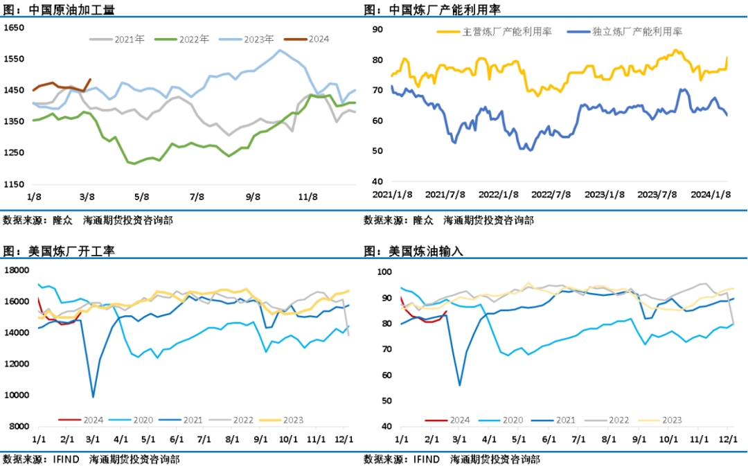 雖然市場對歐佩克+減產是否足量是一直保持懷疑,但毫無疑問在歐佩克+減產努力下,石油市場供需平衡處在相對健康的狀態(tài),最新一期的EIA數(shù)據顯示3月1日當周美國國內原油產量減少10.0萬桶/日至1320.0萬桶/日。除卻戰(zhàn)略儲備的商業(yè)原油庫存增加136.7萬桶至4.49億桶,增幅0.31%。3月1日當周美國戰(zhàn)略石油儲備(SPR)庫存增加70.6萬桶至3.61億桶,增幅0.2%。庫欣庫存增加70.1萬桶,汽油庫存減少446桶,預期減少164萬桶;精煉油庫存減少413萬桶,預期減少66.5萬桶。另外富查伊拉、新加坡等地周度數(shù)據均顯示油品庫存下降,石油市場庫存整體繼續(xù)下降顯示了目前市場供需在一個相對健康的狀態(tài)。沙特阿美將4月運往亞洲的阿拉伯輕質原油OSP設定為每桶較阿曼迪拜均價升水1.70美元,略高于此前的升水1.50美元,也顯示了石油市場供需緊平衡狀態(tài)。原油加工量方面,上周中美都有明顯提升。值得一提的是,上周中國主營煉廠開工率大幅提升,獨立煉廠開工率則持續(xù)回落。美國原油表需有顯著走強,超歷史同期平均水平。同時,煉廠角度的加工量環(huán)比有大幅增長,美國煉廠的檢修季步入尾聲,煉廠表現(xiàn)環(huán)比走強。成品油表需環(huán)比大幅走強,各類主要油品表需走勢較為強勢。出行方面,主要油品汽油和航煤環(huán)比都有不同程度走強;工業(yè)油品方面,餾分油大幅走強,但丙烷&丙烯有明顯回落。