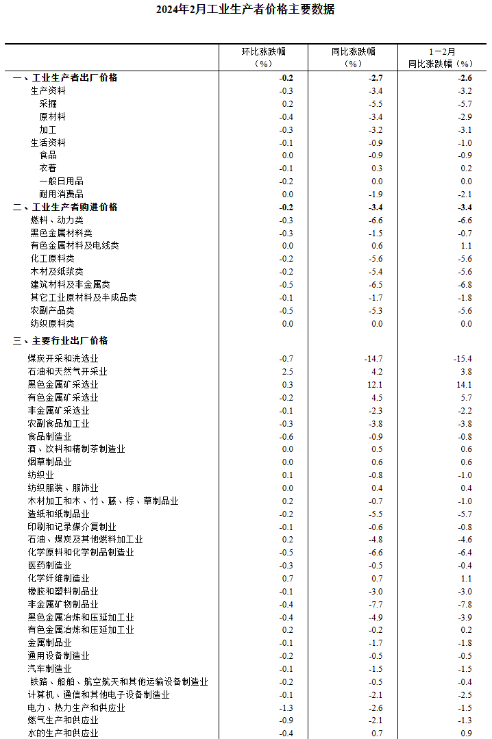 2024年2月份,全國工業(yè)生產(chǎn)者出廠價(jià)格同比下降2.7%,環(huán)比下降0.2%;工業(yè)生產(chǎn)者購進(jìn)價(jià)格同比下降3.4%,環(huán)比下降0.2%。1—2月平均,工業(yè)生產(chǎn)者出廠價(jià)格比上年同期下降2.6%,工業(yè)生產(chǎn)者購進(jìn)價(jià)格下降3.4%。