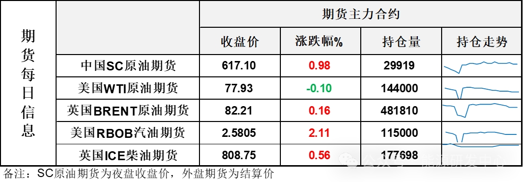 【1】WTI主力原油期貨收跌0.08美元,跌幅0.1%,報(bào)77.93美元/桶;布倫特主力原油期貨收漲0.13美元,漲幅0.16%,報(bào)82.21美元/桶;INE原油期貨收漲0.98%,報(bào)617.1元。