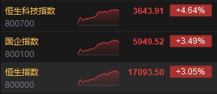 3月12日消息,今日港股三大指數(shù)高開暴走,截至收盤,恒生指數(shù)(17093.5, 505.93, 3.05%)漲3.05%,報17093.5點,恒生科技指數(shù)(3643.91, 161.62, 4.64%)漲4.64%,國企指數(shù)漲3.49%。盤面上,科網(wǎng)股集體上漲,小米集團(tuán)、嗶哩嗶哩漲超11%,京東漲近8%,美團(tuán)、百度、騰訊漲超4%,阿里巴巴漲近3%;內(nèi)房股領(lǐng)漲大市,旭輝控股集團(tuán)(0.34, 0.06, 19.30%)漲超19%領(lǐng)銜;餐飲股漲勢強勁,海倫司(3.51, 0.46, 15.08%)漲超15%;體育用品股全線上漲,李寧(22.1, 1.65, 8.07%)漲超8%;汽車股集體上漲,比亞迪、小鵬漲超6%;黃金股逆勢下跌,中國黃金國際(41.45, -2.60, -5.90%)跌近6%;另外,乳制品、鋰電池、啤酒、物流、影視等板塊均漲幅明顯。