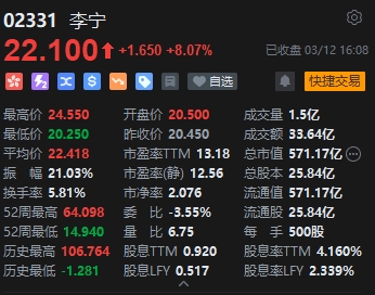 港股李寧一度漲近20%,最終收漲8.07%。據(jù)多位知情人士稱,中國億萬富翁企業(yè)家、前奧運會冠軍李寧正考慮將其同名運動服裝公司私有化。消息人士稱,李寧考慮領(lǐng)導(dǎo)一個財團(tuán)收購香港上市的李寧有限公司,從而開啟新的篇章。其中兩位知情人士說,李寧已與包括TPG、PAG和高瓴資本在內(nèi)的多家全球和地區(qū)性私募股權(quán)公司接洽,看他們是否有興趣作為投資者加入。該公司2023年中期報告顯示,李寧持有公司略高于10%的股份。