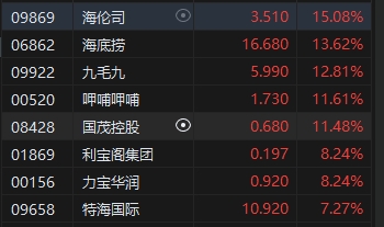 餐飲股漲勢強勁,海倫司漲超15%。上海證券指出,2023年以來,伴隨餐飲市場的強勢回暖,頭部餐飲企業(yè)開放加盟趨勢愈加明顯,不少品牌選擇開放加盟擴(kuò)充市場。餐飲行業(yè)回暖趨勢強勁,連鎖化進(jìn)程不斷加快。海底撈(16.68, 2.00, 13.62%)順應(yīng)餐飲市場加盟潮,擴(kuò)大品牌影響力,有助于其增強營運能力,引入更多優(yōu)質(zhì)資源,提升營運效率,助力未來持續(xù)下沉擴(kuò)張。建議關(guān)注海底撈、九毛九(5.99, 0.68, 12.81%)。