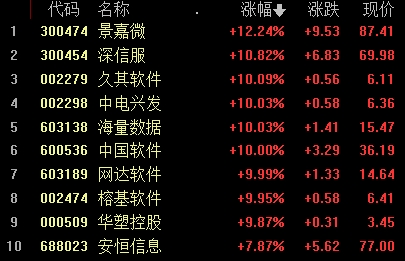 中國軟件、榕基軟件、太極股份(27.590, 1.13, 4.27%)、中國長城(10.700, 0.12, 1.13%)等多股活躍。