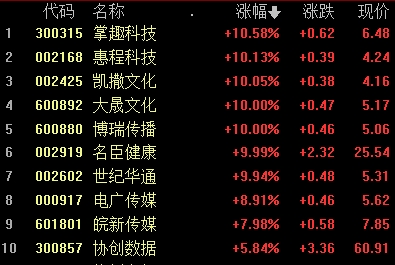 慈文傳媒(8.090, 0.62, 8.30%)、惠程科技(4.240, 0.39, 10.13%)(維權(quán))、大晟文化(5.170, 0.47, 10.00%)、掌趣科技(6.480, 0.62, 10.58%)等多股走強(qiáng)。