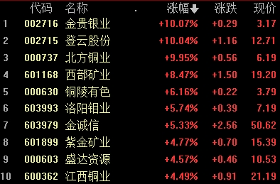 北方銅業(yè)、銅陵有色(3.790, 0.00, 0.00%)、云南銅業(yè)(11.990, 0.00, 0.00%)、西部礦業(yè)(19.200, 0.00, 0.00%)等多股走強(qiáng)。