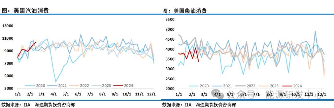 庫(kù)存方面,IEA判斷石油水上儲(chǔ)存量達(dá)到自新冠疫情高峰以來(lái)的第二高水平。全球陸上石油庫(kù)存連續(xù)第七個(gè)月下降,降至至少2016年以來(lái)的最低水平。EIA周度庫(kù)存數(shù)據(jù)顯示除卻戰(zhàn)略?xún)?chǔ)備的商業(yè)原油庫(kù)存減少153.6萬(wàn)桶至4.47億桶,降幅0.34%。戰(zhàn)略石油儲(chǔ)備(SPR)庫(kù)存增加59.6萬(wàn)桶至3.616億桶,增幅0.17%。庫(kù)欣庫(kù)存減少22萬(wàn)桶,汽油庫(kù)存減少566.2桶,預(yù)期減少180萬(wàn)桶;精煉油庫(kù)存增加88.8萬(wàn)桶,預(yù)期減少15萬(wàn)桶。美國(guó)至3月8日當(dāng)周EIA汽油庫(kù)存降幅錄得2023年11月3日當(dāng)周以來(lái)最大,為連續(xù)第6周錄得下降。精煉油庫(kù)存增幅錄得2024年1月12日當(dāng)周以來(lái)最大,結(jié)束此前連續(xù)7周的下降趨勢(shì)。整體來(lái)看石油市場(chǎng)庫(kù)存整體處于降庫(kù)階段對(duì)油價(jià)友好。