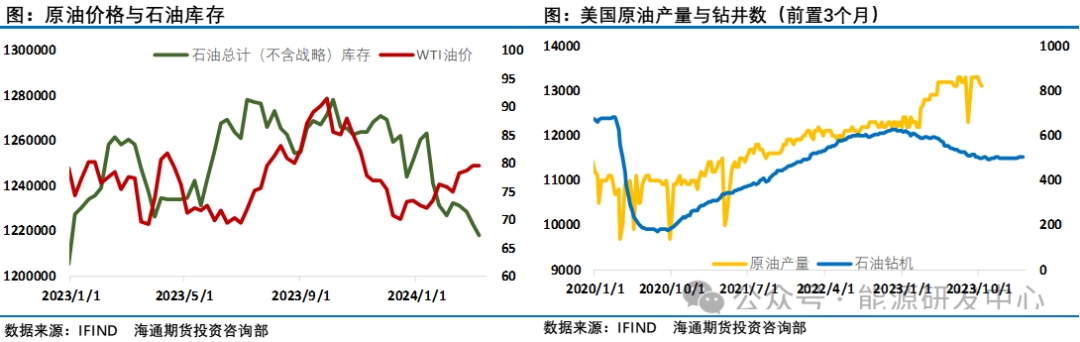 對(duì)于供應(yīng)IEA判斷全球石油供應(yīng)將在2024年增加80萬(wàn)桶/日,達(dá)到1.029億桶/日。由于歐佩克+減產(chǎn)措施,2024年全年石油市場(chǎng)將面臨供應(yīng)不足。歐佩克+今年晚些時(shí)候似乎還有提高石油產(chǎn)量的空間。如果歐佩克解除減產(chǎn)措施,石油市場(chǎng)可能在下半年出現(xiàn)供應(yīng)過(guò)剩。俄羅斯2月原油產(chǎn)量增加2萬(wàn)桶/日至942萬(wàn)桶。OPEC公布最新月度原油市場(chǎng)報(bào)告。月報(bào)顯示,盡管歐佩克+實(shí)施新的自愿減產(chǎn)措施,但由利比亞和尼日利亞帶動(dòng),原油產(chǎn)量在2月份增加了20.3萬(wàn)桶/日,達(dá)到2657萬(wàn)桶/日。而EIA短期能源展望中預(yù)計(jì)2024年美國(guó)原油產(chǎn)量將增加26萬(wàn)桶/日,此前預(yù)期為增加17萬(wàn)桶/日。預(yù)計(jì)2025年美國(guó)原油產(chǎn)量將增加46萬(wàn)桶/日,此前為增加39萬(wàn)桶/日。預(yù)計(jì)2024年美國(guó)原油產(chǎn)量為1319萬(wàn)桶/日,此前預(yù)期為1310萬(wàn)桶/日。預(yù)計(jì)2025年美國(guó)原油產(chǎn)量為1365萬(wàn)桶/日,此前預(yù)期為1349萬(wàn)桶/日。不過(guò)最近EIA周度數(shù)據(jù)顯示近期美國(guó)原油產(chǎn)量連續(xù)第二周下滑10萬(wàn)桶/日,目前只有1310萬(wàn)桶/日。