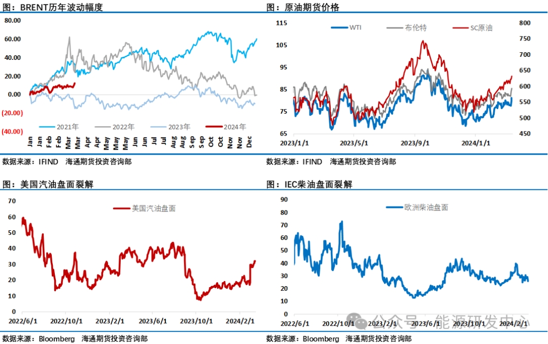 周五歐美油價(jià)微跌,比較大的變化是隨著SC原油(629, 2.30, 0.37%)近月合約隨著合約換月和臨近自然人最后持倉(cāng)日資金退出油價(jià)退燒明顯,周五出現(xiàn)大幅回落,SC原油與歐美油價(jià)跨區(qū)價(jià)差收縮2美元。過(guò)去一周全球各區(qū)域油價(jià)紛紛刷新了年內(nèi)高點(diǎn),WTI和布倫特原油先后突破了80美元、85美元關(guān)口,SC原油近月合約更是一度越過(guò)了650元關(guān)口。在3月12-14日三大機(jī)構(gòu)公布月報(bào)這個(gè)時(shí)間窗口,油價(jià)借利多消息集中發(fā)力突破了過(guò)去幾周來(lái)的窄幅震蕩區(qū)間。盡管市場(chǎng)上對(duì)歐佩克+減產(chǎn)執(zhí)行力度有不同聲音,但從各機(jī)構(gòu)3月月報(bào)觀(guān)點(diǎn)的調(diào)整可以看出歐佩克+減產(chǎn)對(duì)原油市場(chǎng)供需平衡的影響還是非常明顯,核心機(jī)構(gòu)普遍基于歐佩克+減產(chǎn)帶來(lái)的影響調(diào)整了對(duì)油市預(yù)期,IEA稱(chēng)由于歐佩克+減產(chǎn)措施,2024年全年石油市場(chǎng)將面臨供應(yīng)不足。而稍早公布的EIA短期能源展望報(bào)告更是大幅上調(diào)了油價(jià)預(yù)期,預(yù)計(jì)2024年WTI原油價(jià)格為82.15美元/桶,此前預(yù)期為77.68美元/桶;預(yù)計(jì)2024年布倫特原油價(jià)格為87美元/桶,此前預(yù)期為82.42美元/桶。