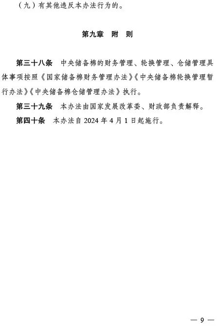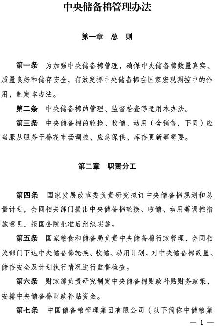 日前,國(guó)家發(fā)展改革委、財(cái)政部聯(lián)合印發(fā)《中央儲(chǔ)備棉管理辦法》(以下簡(jiǎn)稱《辦法》),該《辦法》是為了貫徹落實(shí)黨中央、國(guó)務(wù)院關(guān)于加強(qiáng)儲(chǔ)備體系建設(shè)的決策部署,進(jìn)一步強(qiáng)化中央儲(chǔ)備棉管理,更好發(fā)揮中央儲(chǔ)備棉在宏觀調(diào)控中的作用。自2024年4月1日起《辦法》正式施行。