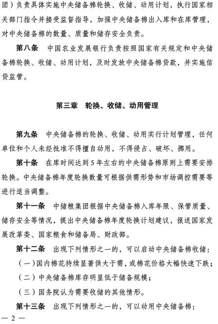 一是服務(wù)宏觀調(diào)控。堅(jiān)持中央儲(chǔ)備棉輪換、收儲(chǔ)、動(dòng)用(含銷售,下同)應(yīng)當(dāng)服從服務(wù)于棉花市場(chǎng)調(diào)控、應(yīng)急保供、庫存更新等需要的總要求,明確啟動(dòng)中央儲(chǔ)備棉輪換、收儲(chǔ)、動(dòng)用的具體情形。