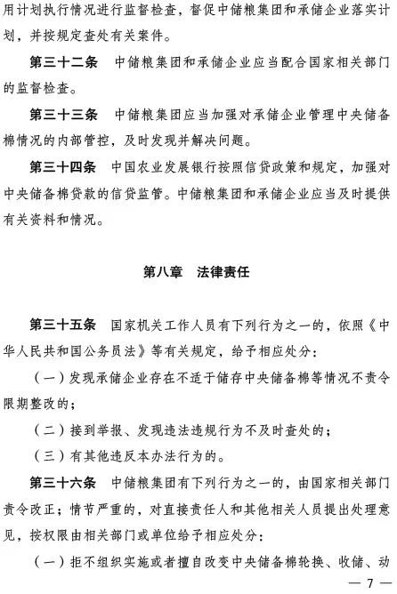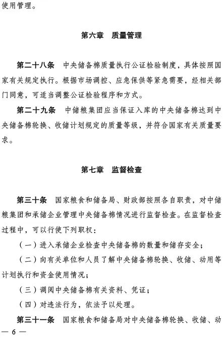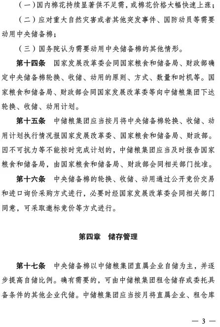 二是明確職責(zé)程序。界定國(guó)家發(fā)展改革委、國(guó)家糧食和儲(chǔ)備局、財(cái)政部等部門和單位在中央儲(chǔ)備棉管理中的職責(zé),并規(guī)定了中央儲(chǔ)備棉計(jì)劃下達(dá)程序、執(zhí)行報(bào)告要求和操作方式等。
