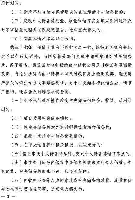 四是加強(qiáng)監(jiān)督檢查。明確相關(guān)部門對(duì)中央儲(chǔ)備棉管理情況和輪換、收儲(chǔ)、動(dòng)用計(jì)劃執(zhí)行情況的監(jiān)督檢查職責(zé)、職權(quán),并對(duì)違反辦法規(guī)定的行為予以相應(yīng)處罰。