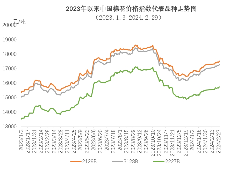 2月,中國棉花價格指數(shù)(CCIndex3128B)持續(xù)上漲。月內(nèi)受春節(jié)假期影響,新棉加工增速大幅放緩,月中企業(yè)陸續(xù)放假,補庫意愿降低,市場交投氛圍冷清;春節(jié)后棉花企業(yè)銷售積極性較高,但由于紡織企業(yè)節(jié)前補庫,原料庫存基本充足,紡織企業(yè)新增訂單較少,現(xiàn)貨成交情況一般?,F(xiàn)貨價格隨期貨走高,但國外棉價漲幅大于國內(nèi)棉價,內(nèi)外棉價差逐漸倒掛,部分企業(yè)增加新疆棉使用占比。2月29日,中國棉花價格指數(shù)(CCIndex3128B)收于17295元/噸,環(huán)比上漲300元;月均價為17107元/噸,環(huán)比上漲417元,同比上漲1395元。