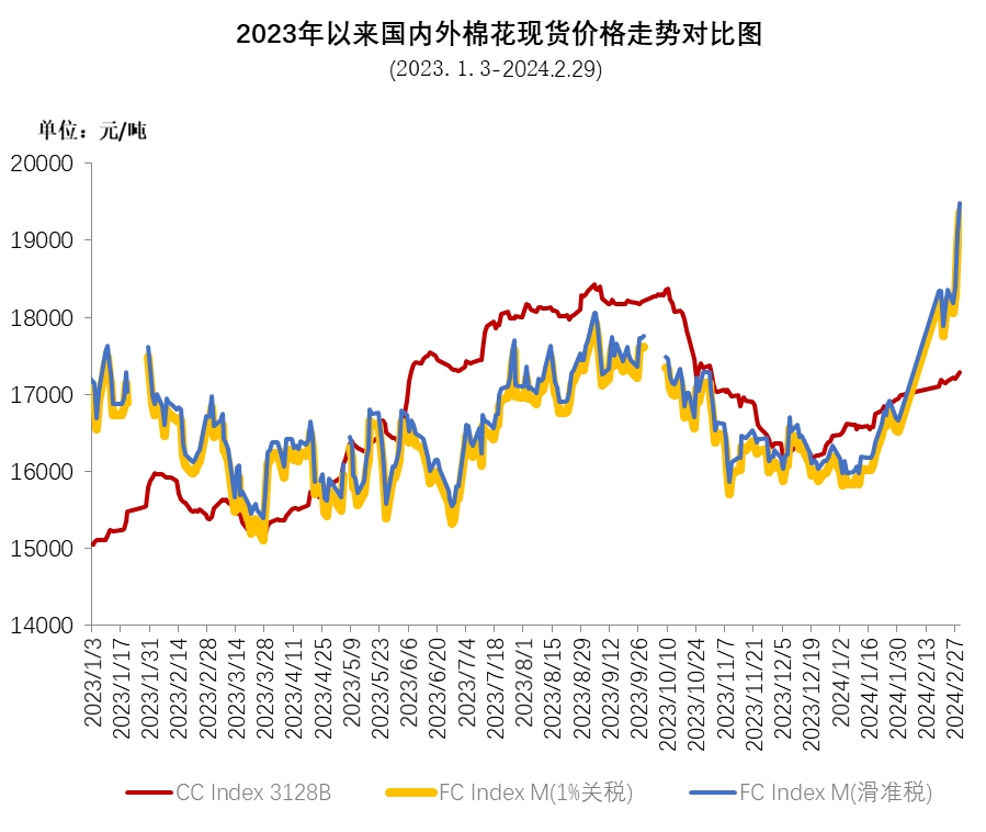 2月,受外圍股市、能源市場走高的帶動,加上USDA報告調(diào)減了2023/24年度全球棉花產(chǎn)量,調(diào)增消費量,推動棉價持續(xù)上漲,ICE期棉主力合約突破100美分/磅,最高漲至103.8美分/磅,月末因美棉簽約數(shù)據(jù)表現(xiàn)不佳,ICE期棉主力合約回落至100美分/磅以下。ICE期棉主力合約2月均結(jié)算價在92.61美分/磅,環(huán)比上漲10.04美分,漲幅12.2%。中國進口棉價格指數(shù)FCIndex M月均為101.82美分/磅,環(huán)比上漲8.92美分;月底為110.97美分/磅,環(huán)比上漲15.7美分,1%關稅下折人民幣19368元/噸,高于同期中國棉花價格指數(shù)(CCIndex3128B)2073元。