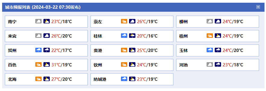 南寧市:今天白天陰天、局地有小雨,今天晚上陰天到多云,南風(fēng)2~3級(jí),最高氣溫23℃,最低氣溫18℃。