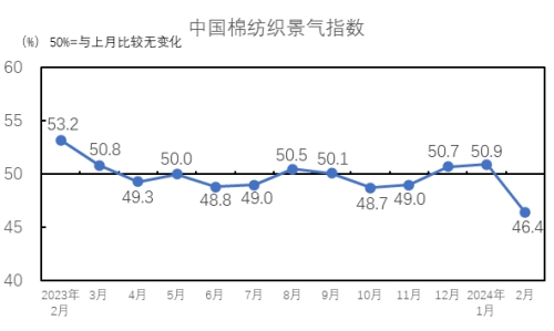 2月份,中國棉紡織景氣指數(shù)為46.4%,較1月下降4.5個(gè)百分點(diǎn)。國家統(tǒng)計(jì)局發(fā)布的2024年1月中國制造業(yè)采購經(jīng)理指數(shù)為49.1%,較1月下降0.1個(gè)百分點(diǎn)。2月份,由于春節(jié)假日因素影響,制造業(yè)處于傳統(tǒng)生產(chǎn)淡季,加之疫情防控平穩(wěn)轉(zhuǎn)段后企業(yè)員工假期返鄉(xiāng)增多,企業(yè)生產(chǎn)經(jīng)營受到較大影響,制造業(yè)市場活躍度總體有所下降。