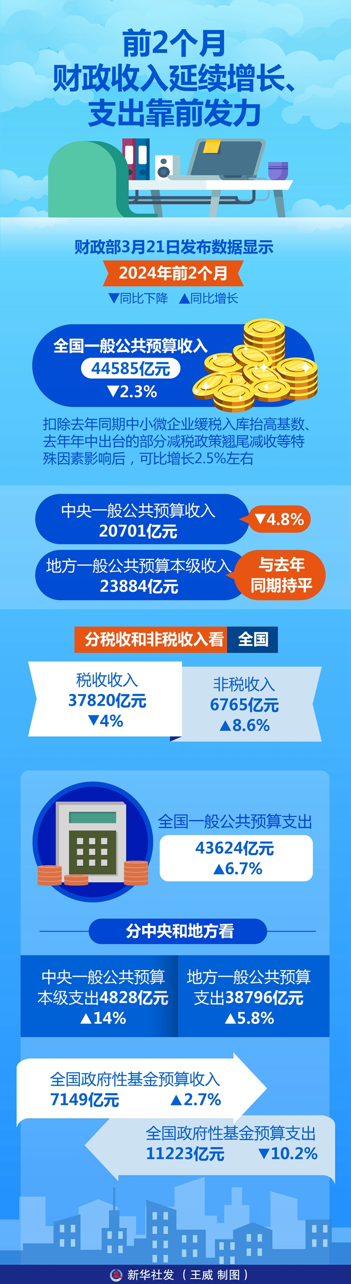 財(cái)政部21日發(fā)布數(shù)據(jù)顯示,今年前2個(gè)月,全國一般公共預(yù)算收入44585億元,同比下降2.3%;扣除去年同期中小微企業(yè)緩稅入庫抬高基數(shù)、去年年中出臺的部分減稅政策翹尾減收等特殊因素影響后,可比增長2.5%左右。