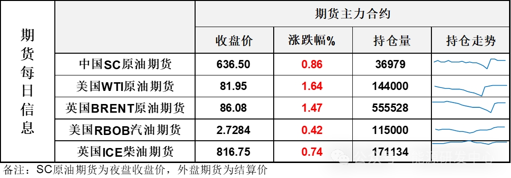 【1】WTI主力原油期貨收漲1.32美元,漲幅1.64%,報(bào)81.95美元/桶;布倫特主力原油期貨收漲1.25美元,漲幅1.47%,報(bào)86.08美元/桶;INE原油期貨收漲0.86%,報(bào)636.5元。