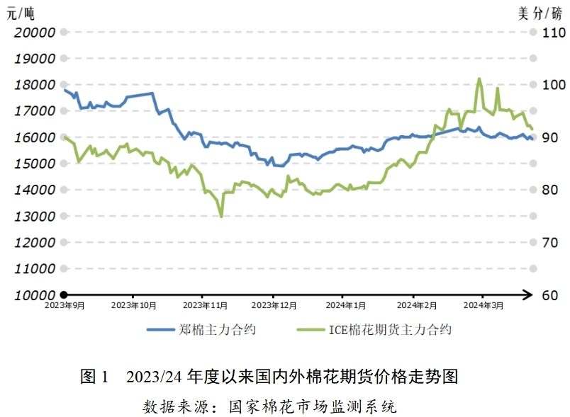 2023/24年度國際棉花供需充裕狀況有所收緊,終端服裝市場(chǎng)去庫仍較緩慢。2月底以來ICE期價(jià)大漲后回調(diào),暫時(shí)處于盤整狀態(tài)。