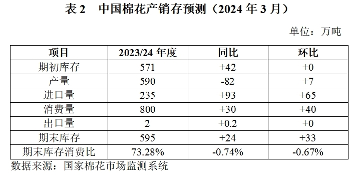 據(jù)國家棉花市場(chǎng)監(jiān)測(cè)系統(tǒng)預(yù)測(cè),2023/24年度中國棉花產(chǎn)量590萬噸,環(huán)比調(diào)增7萬噸;消費(fèi)量800萬噸,環(huán)比調(diào)增40萬噸;產(chǎn)需缺口210萬噸,同比擴(kuò)大112萬噸。進(jìn)口量235萬噸,環(huán)比調(diào)增65萬噸;期末庫存595萬噸,環(huán)比調(diào)增33萬噸。