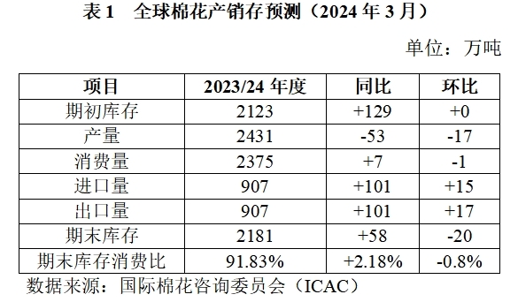 3月,據(jù)國際棉花咨詢委員會(huì)(ICAC)預(yù)測(cè),2023/24年度全球棉花產(chǎn)量2431萬噸,環(huán)比調(diào)減17萬噸;棉花消費(fèi)量2375萬噸,環(huán)比調(diào)減1萬噸;期末庫存2181萬噸,環(huán)比調(diào)減20萬噸;棉花庫存消費(fèi)比91.83%,環(huán)比調(diào)減0.8個(gè)百分點(diǎn)。其中調(diào)增中國消費(fèi)量30萬噸、進(jìn)口量25萬噸,調(diào)增巴西、美國出口量21萬噸、4萬噸。
