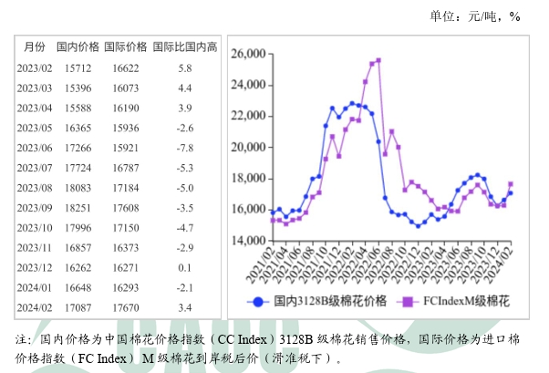(二)國際棉價環(huán)比上漲。美國棉花加工基本結(jié)束,印度籽棉交售進(jìn)入尾聲,國際棉花市場供應(yīng)逐步減少;全球消費(fèi)需求有所回暖,紡織業(yè)呈現(xiàn)一定改善跡象,加之美國農(nóng)業(yè)部2月報告調(diào)減全球產(chǎn)量和庫存,國際棉價較快上漲。據(jù)USDA統(tǒng)計,截至2月15日,美國累計凈簽約出口2023/24年度棉花241.54萬噸,達(dá)年度預(yù)期出口量的89.9%,出口進(jìn)度表現(xiàn)良好。2月份,Cotlook A指數(shù)(相當(dāng)于國內(nèi)3128B級棉花)月均價每磅98.78美分,環(huán)比漲7.5%,同比跌0.6%。