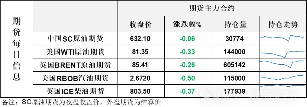 【1】WTI主力原油期貨收跌0.27美元,跌幅0.33%,報81.35美元/桶;布倫特主力原油期貨收跌0.22美元,跌幅0.26%,報85.41美元/桶;INE原油期貨收跌0.06%,報632.1元。