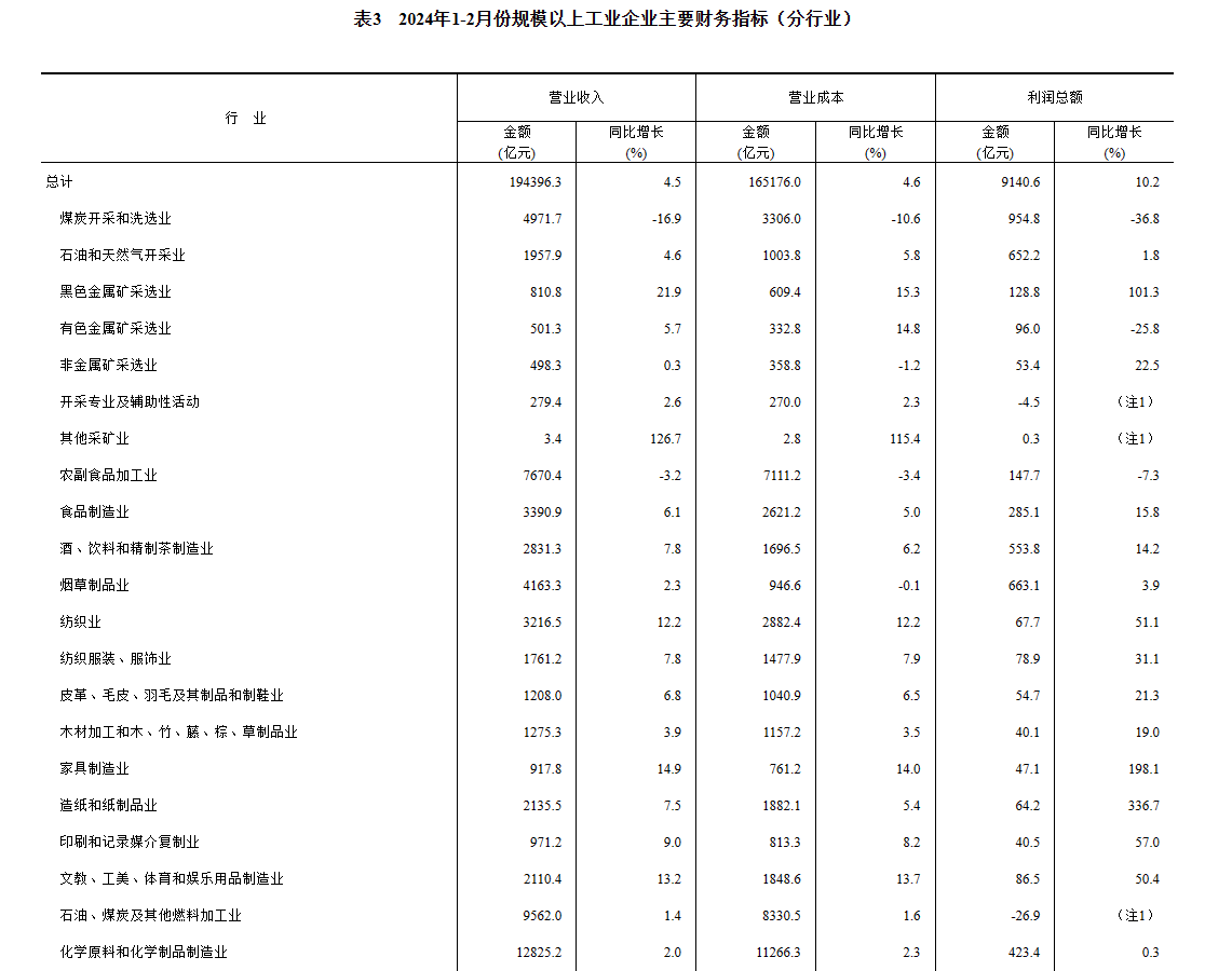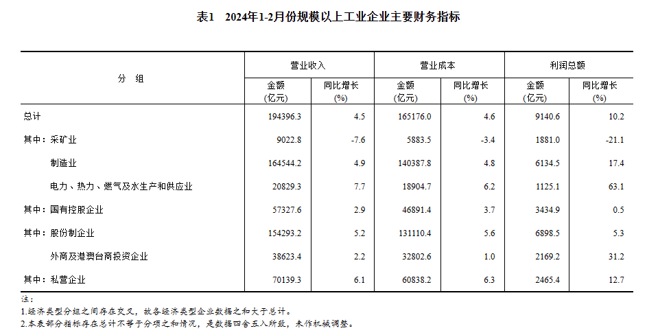 1—2月份,全國規(guī)模以上工業(yè)企業(yè)實(shí)現(xiàn)利潤總額9140.6億元,同比增長10.2%(按可比口徑計(jì)算,詳見附注二)。