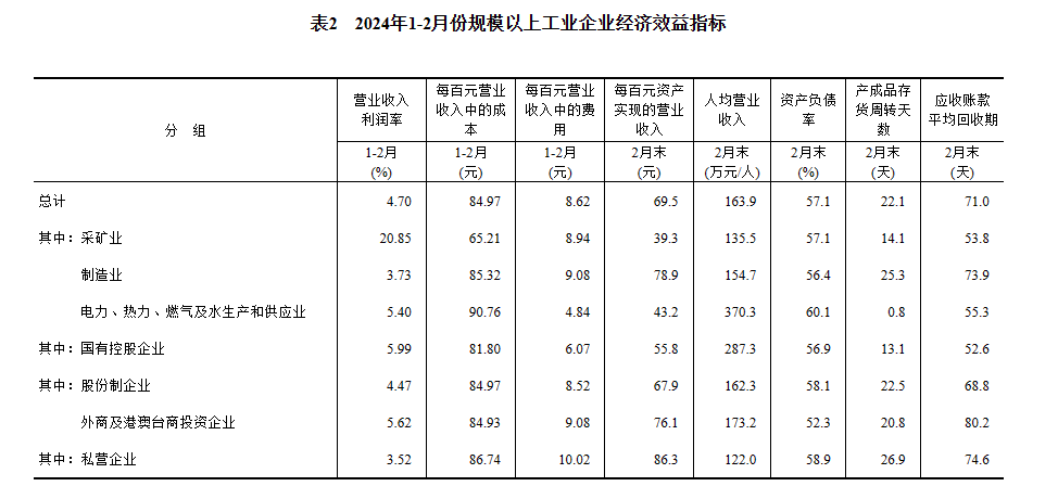 1—2月份,規(guī)模以上工業(yè)企業(yè)實(shí)現(xiàn)營業(yè)收入19.44萬億元,同比增長4.5%;發(fā)生營業(yè)成本16.52萬億元,增長4.6%;營業(yè)收入利潤率為4.70%,同比提高0.24個(gè)百分點(diǎn)。
