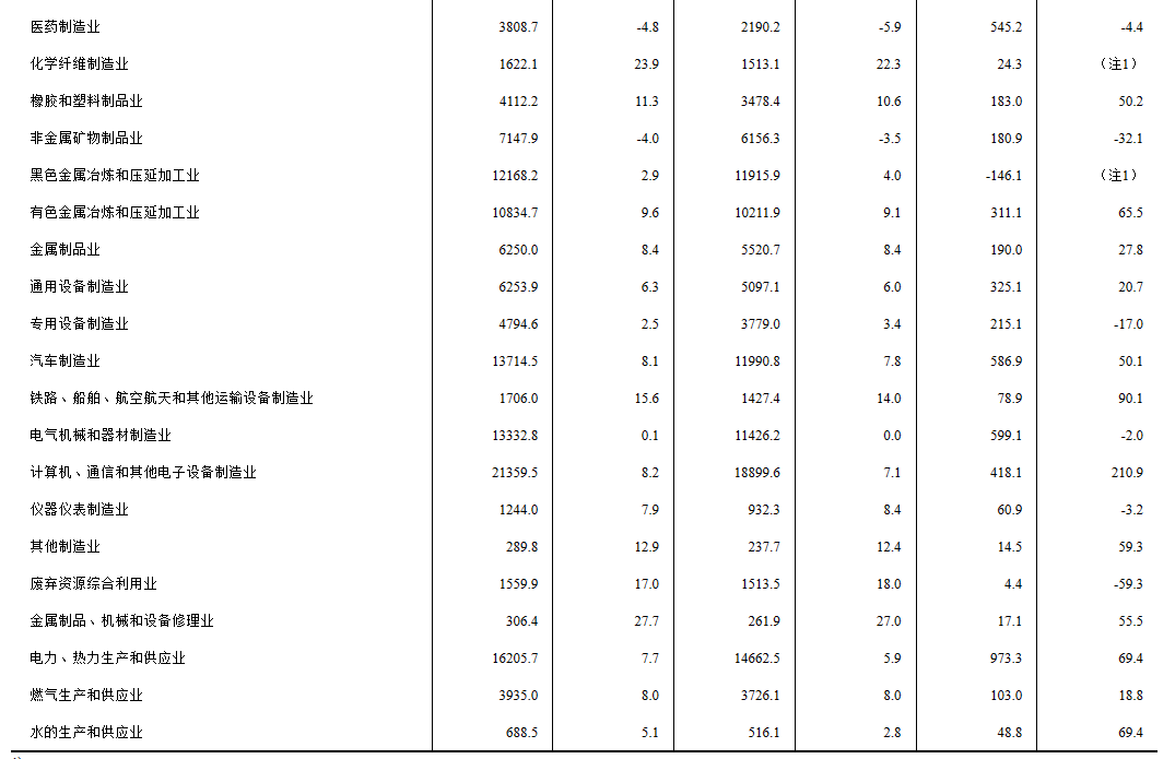 1—2月份,主要行業(yè)利潤情況如下:計(jì)算機(jī)、通信和其他電子設(shè)備制造業(yè)利潤增長2.1倍,電力、熱力生產(chǎn)和供應(yīng)業(yè)增長69.4%,有色金屬冶煉和壓延加工業(yè)增長65.5%,紡織業(yè)增長51.1%,汽車制造業(yè)增長50.1%,通用設(shè)備制造業(yè)增長20.7%,石油和天然氣開采業(yè)增長1.8%,化學(xué)原料和化學(xué)制品制造業(yè)增長0.3%,煤炭開采和洗選業(yè)下降36.8%,非金屬礦物制品業(yè)下降32.1%,專用設(shè)備制造業(yè)下降17.0%,農(nóng)副食品加工業(yè)下降7.3%,電氣機(jī)械和器材制造業(yè)下降2.0%,石油煤炭及其他燃料加工業(yè)和黑色金屬冶煉和壓延加工業(yè)虧損均增加。