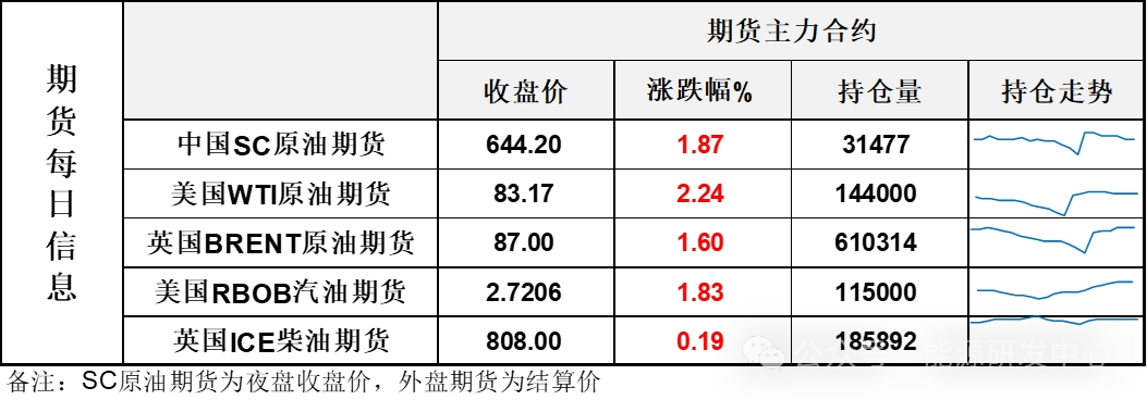 【1】WTI主力原油期貨收漲1.82美元,漲幅2.24%,報83.17美元/桶;布倫特主力原油期貨收漲1.37美元,漲幅1.6%,報87美元/桶;INE原油期貨收漲1.87%,報644.2元。