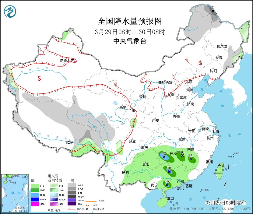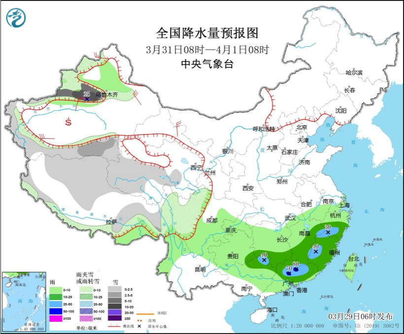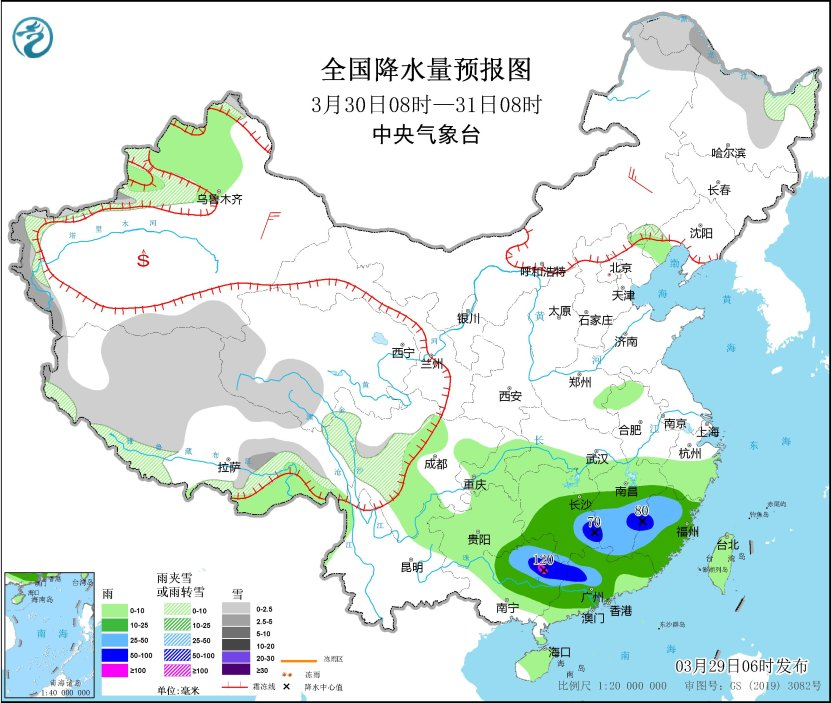 3月30日08時至31日08時,黑龍江北部、新疆南疆高海拔山區(qū)、西藏大部、青海西部、川西高原南部等地部分地區(qū)有小到中雪或雨夾雪。湖南中南部、江南中南部、福建大部、廣西西北部、廣東大部等地部分地區(qū)有中到大雨,其中,湖南東南部、江西西南部和東部、福建西部、廣西東北部、廣東西部等地部分地區(qū)有暴雨或大暴雨(100~120毫米)。內(nèi)蒙古東南部、新疆東部等地部分地區(qū)有4~5級風(見圖3)。