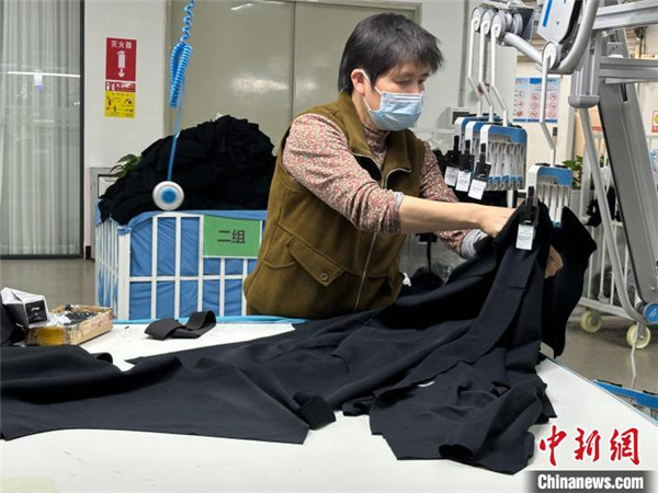 圖為車縫工人將裁剪好的衣服掛在智能吊掛機(jī)上