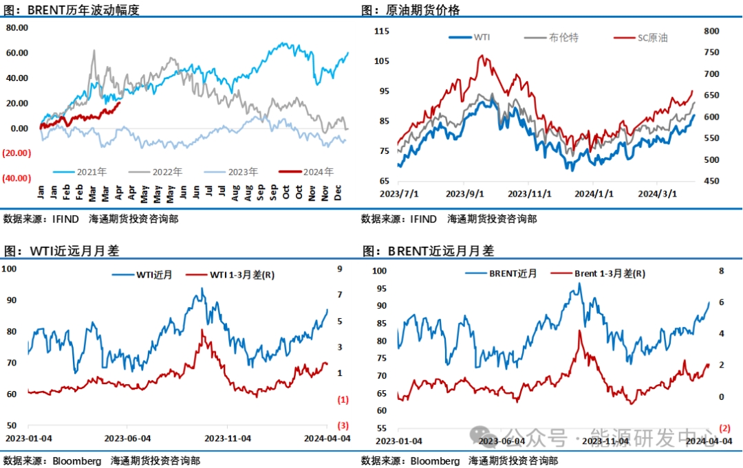 從持倉數(shù)據(jù)來看,美國商品期貨交易委員會(CFTC)公布數(shù)據(jù)顯示截至4月2日當周,WTI原油投機性凈多頭持倉增加9,842手至207,549手,ICE布倫特原油投機凈多頭寸增加9867手至299,835手,緊張地緣局勢讓投資者不斷押注油價走高。油價從去年年底低點至今累計上漲了19美元,年內(nèi)最大漲幅接近20%,雖然2021年,2022年油價軍在一季度出現(xiàn)過大漲,但拉長時間周期看這樣的表現(xiàn)在歷史是并不多見,根據(jù)統(tǒng)計2000年以來,油價在一季度期間平均漲幅約6.7%,顯然今年油價的表現(xiàn)是遠超歷史同期均值,尤其是最近油價在地緣因素推動下的拉升更是引發(fā)市場關注,目前地緣因素仍有激化風險,這可能推動油價繼續(xù)沖高,但同時隨著油價來到高位,一旦出現(xiàn)局勢緩解或有需求被抑制跡象,油價高位很容易出現(xiàn)反轉(zhuǎn),大幅波動將會出現(xiàn)。