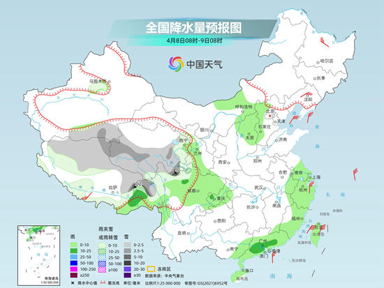 預(yù)計(jì)今天(4月8日),江南、華南等地降雨將明顯減少減弱,迎來降雨間歇期。但在青藏高原中東部,未來三天仍將出現(xiàn)持續(xù)性雨雪天氣。此外,今明兩天,東北、華北等地在冷空氣以及降水的影響下,氣溫將普遍下降。冷空氣過后,上述地區(qū)氣溫又會快速回升。