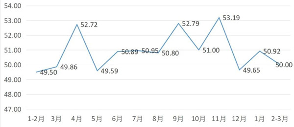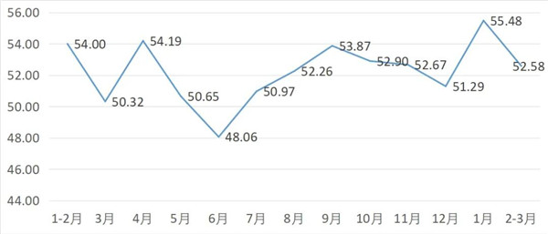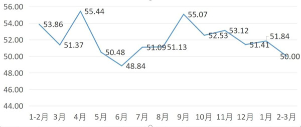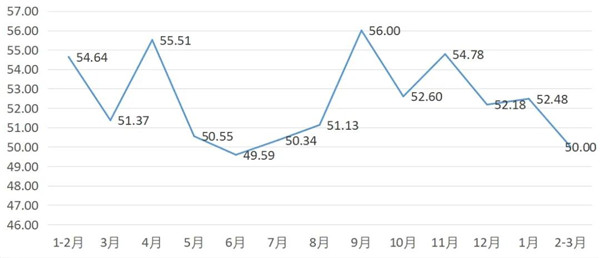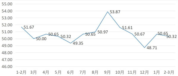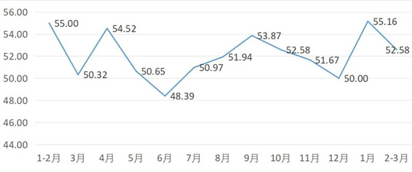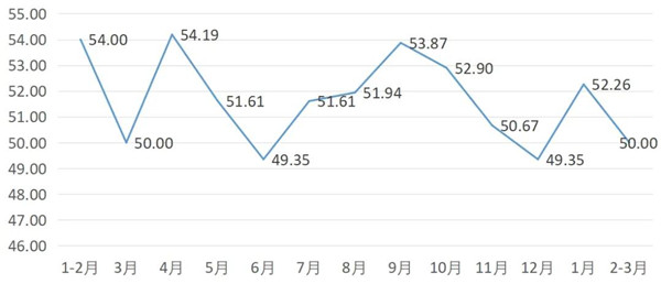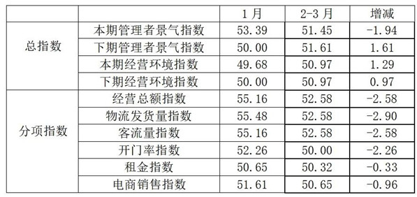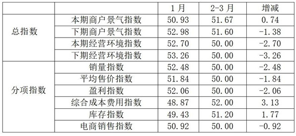 從商戶(hù)景氣指數(shù)來(lái)看,總指數(shù)中,2-3月商戶(hù)景氣指數(shù)為51.67, 較上月上升0.74個(gè)百分點(diǎn);經(jīng)營(yíng)環(huán)境指數(shù)為50.00, 較上月下降2.70個(gè)百分點(diǎn)。