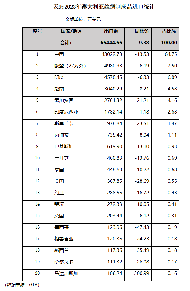 2021-2022年澳大利亞絲綢制成品進(jìn)口的快速增長勢頭在2023年出現(xiàn)轉(zhuǎn)折,全年進(jìn)口額同比下降9.38%。自中國的進(jìn)口比重雖逐年下降,但仍占澳全部進(jìn)口的六成以上,遠(yuǎn)超其他進(jìn)口來源地。其他主要進(jìn)口來源中,自越南和孟加拉國的進(jìn)口保持較快增長。(詳見表9)
