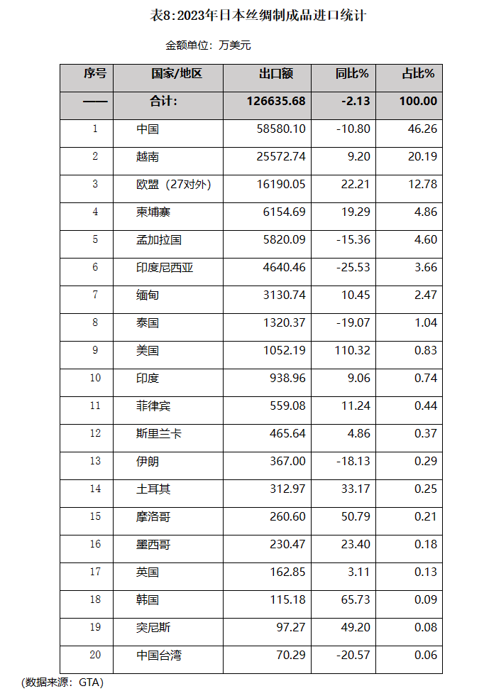 2023年日本絲綢制成品進(jìn)口小幅下降,主要進(jìn)口來源漲跌互現(xiàn)。中國作為日本絲綢制成品第一大進(jìn)口來源地雖進(jìn)口下降較多但其占比仍遙遙領(lǐng)先。自排名第2、3、4位的越南、歐盟和柬埔寨進(jìn)口均出現(xiàn)較大幅度增長。(詳見表8)