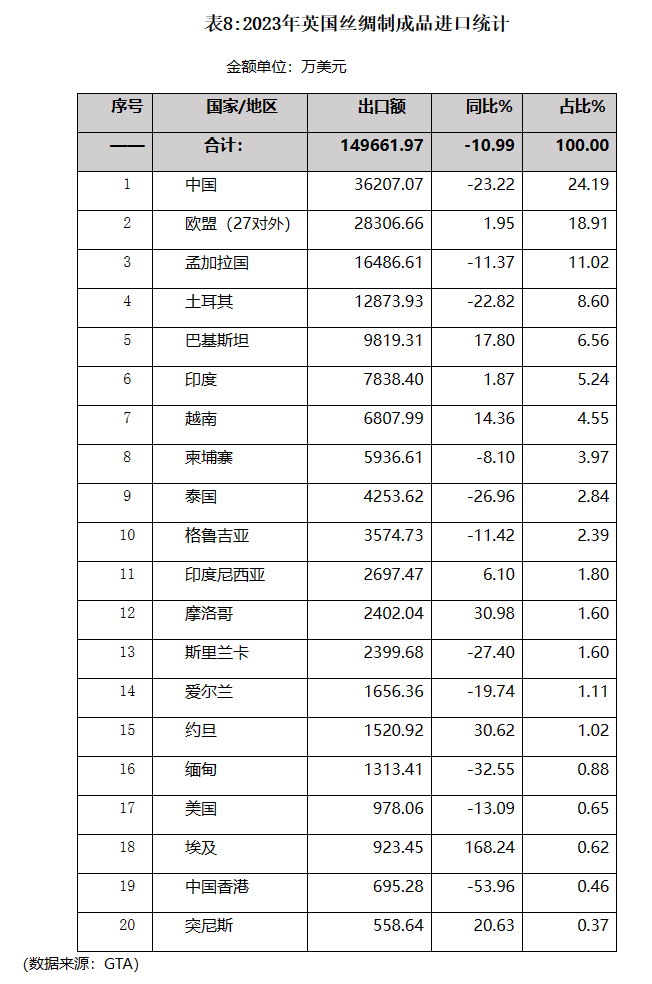 2023年英國絲綢制成品進(jìn)口由前兩年的快速增長轉(zhuǎn)為下降。中國仍是其第一大進(jìn)口來源地,但進(jìn)口額同比降幅在主要來源中最高,達(dá)23.22%,所占份額有所下降。同樣降幅較大的還有土耳其和泰國。主要進(jìn)口來源中,自巴基斯坦和越南的進(jìn)口增幅最高。(詳見表8)