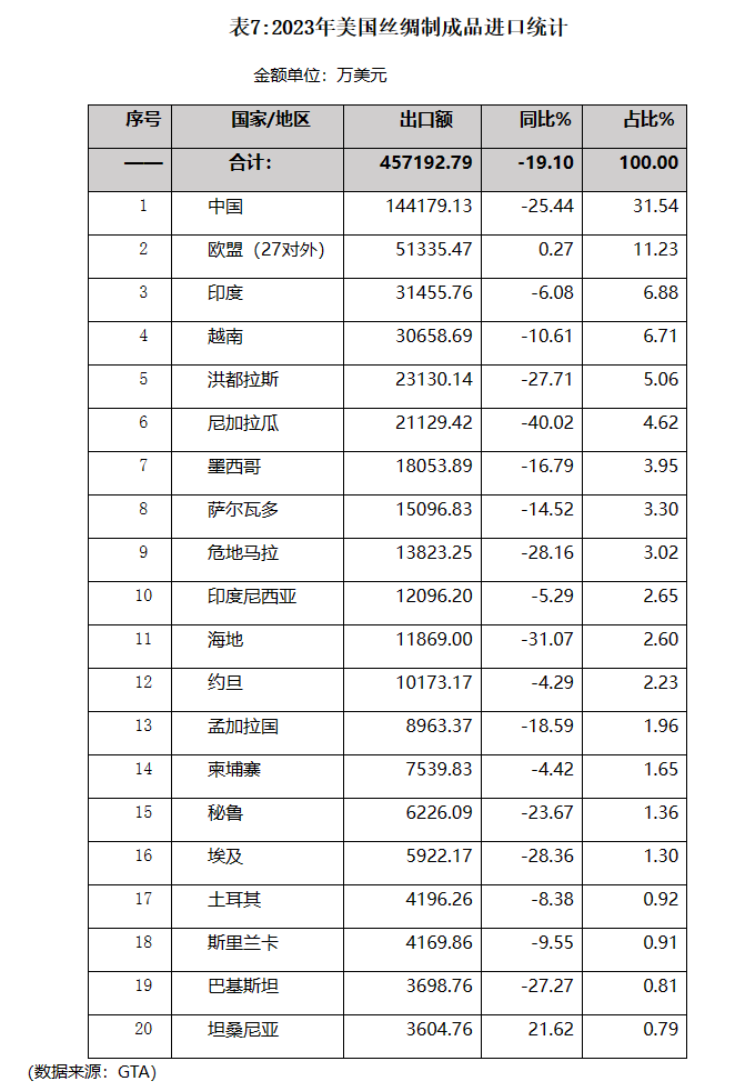 美國2023年絲綢制成品進(jìn)口出現(xiàn)較大幅度下降,主要進(jìn)口來源中,除自歐盟地區(qū)的進(jìn)口出現(xiàn)微幅增長外,自其它主要來源進(jìn)口均出現(xiàn)不同幅度下降。其中自第一大進(jìn)口來源中國的進(jìn)口降幅達(dá)25.44%,其所占份額也有所減少。(詳見表7)