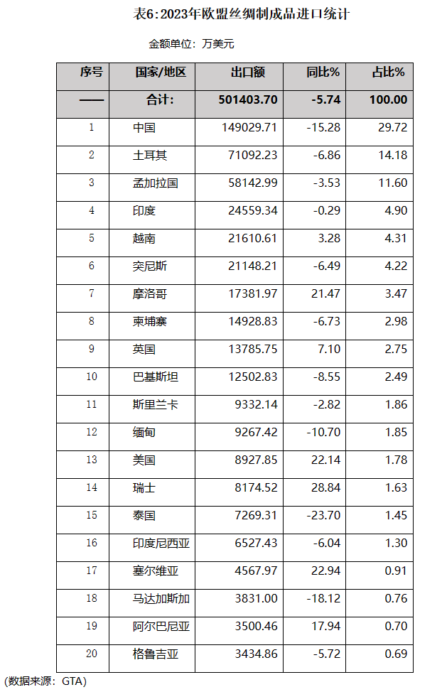 2023年歐盟絲綢制成品進(jìn)口由升轉(zhuǎn)降,全年進(jìn)口同比下降5.74%。主要進(jìn)口來源中,中國穩(wěn)居歐盟絲綢制成品第一大進(jìn)口來源,占比較前兩年略有下降。自越南進(jìn)口近幾年保持持續(xù)增長,其進(jìn)口占比也穩(wěn)步提升,2023年已居第5位。(詳見表6)