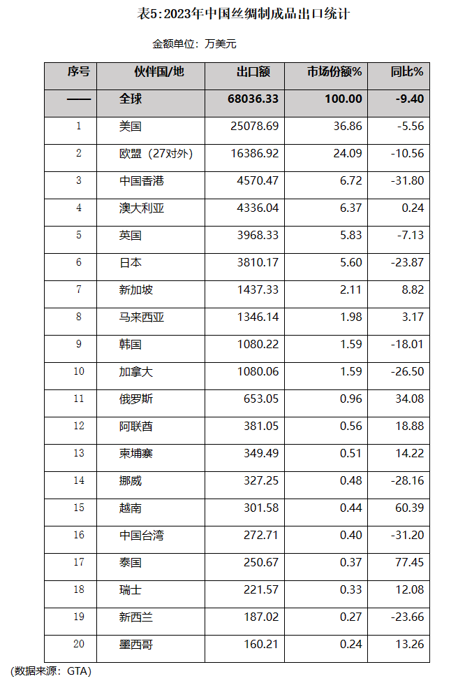 2023年中國絲綢制成品對傳統(tǒng)主要市場出口全面下降,對新興市場出口則有升有降。其中,對中國香港、日本和加拿大的出口降幅均超過了20%。如需更多中國絲綢貿(mào)易情況,請登陸紡織商會網(wǎng)站(www.ccct.org.cn)至絲綢分會欄目查詢。(詳見表5)