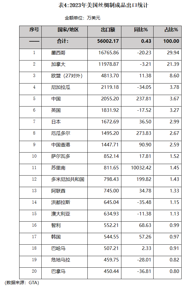 美國近五年絲綢制成品出口一直呈現(xiàn)增長態(tài)勢,2023年雖增速明顯放緩,但全年出口仍保持小幅增長。墨西哥和加拿大是美最主要出口市場,合計(jì)占比超五成,2023年對墨西哥的制成品出口出現(xiàn)較大下降,降幅達(dá)20.23%。2023年美國對中國絲綢制成品出口出現(xiàn)激增,中國的排位從2022年的第12位躍升至第5位,同樣出現(xiàn)出口激增的還有厄瓜多爾、蘇里南和多米尼加。(詳見表4)
