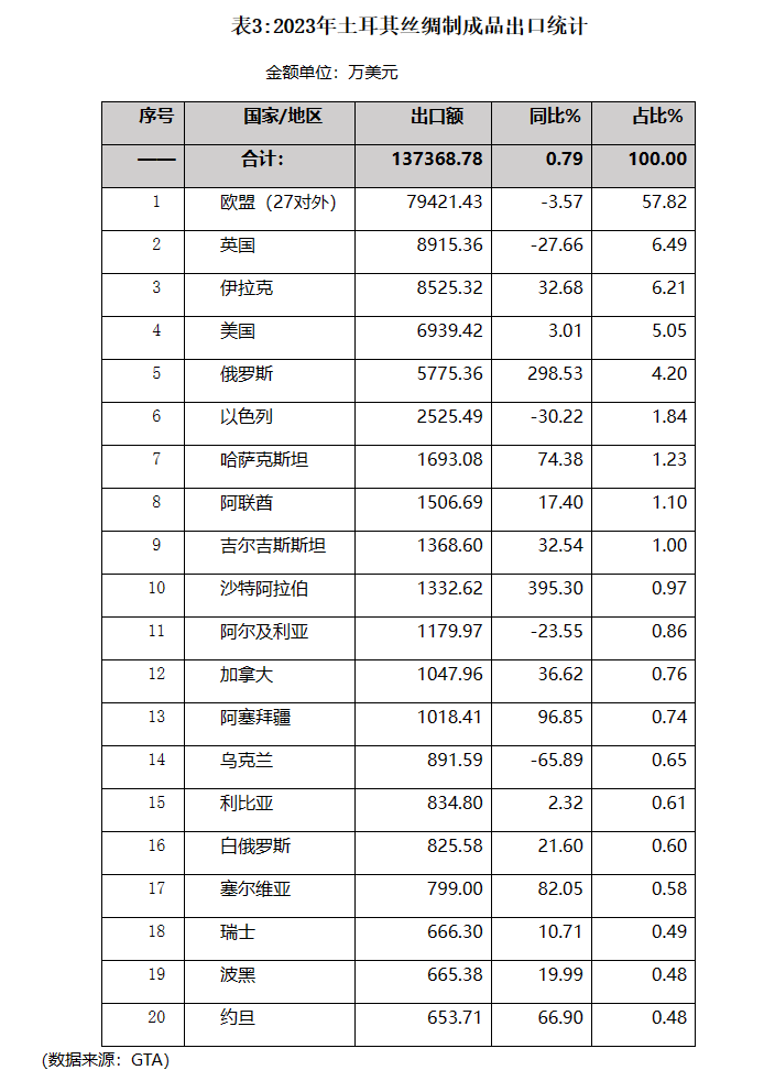 絲綢制成品出口額全球排名第三的土耳其2023年出口13.74億美元,同比增長0.79%。歐盟是土耳其最主要的出口市場,占比近六成,2023年土對歐盟的制成品出口未能延續(xù)前兩年的增長趨勢,出現(xiàn)小幅下降。