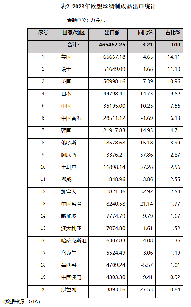 2023年歐盟絲綢制成品出口延續(xù)了2022年的增長態(tài)勢,出口額為46.55億美元,同比增長3.21%,列全球首位。
