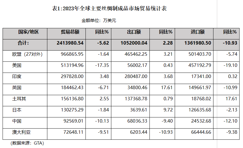 歐盟、美國、印度、土耳其、中國、日本、英國和澳大利亞是世界絲綢制成品貿(mào)易最重要的參與者,2023年7國和歐盟絲綢制成品貿(mào)易總額為241.40億美元,同比下降5.62%。其中出口額105.20億美元,同比增長2.28%;進(jìn)口額136.20億美元,同比下降10.93%。(詳見表1)