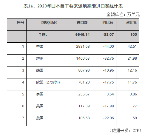 2023年,日本綢緞進(jìn)口額為0.66億美元,同比下降33.07%。
