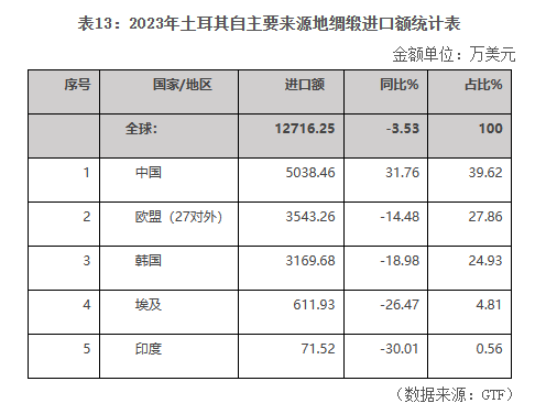 2023年,土耳其綢緞進(jìn)口額為1.27億美元,同比下降3.53%。