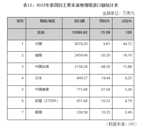 2023年,泰國(guó)綢緞進(jìn)口額為1.36億美元,同比下降15.59%。